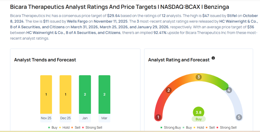 - HC Wainwright & Co. raised the price target for Bicara Therapeutics Inc. (NASDAQ:BCAX) from $40 to $42. HC Wainwright & Co. analyst Robert Burns maintained a Buy rating. Bicara Therapeutics shares closed at $19.04 on Monday. See how other analysts view this stock.