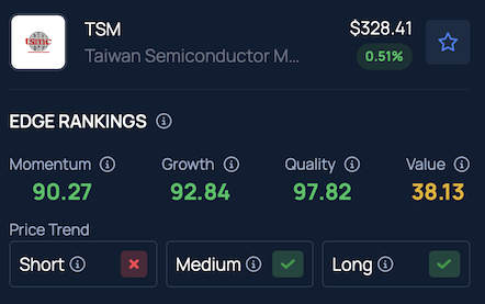 Benzinga Edge Stock Rankings indicate that TSMC is facing short-term downward pressure, while maintaining an upward trend over the medium and long term, with a Quality score in the 97th percentile.