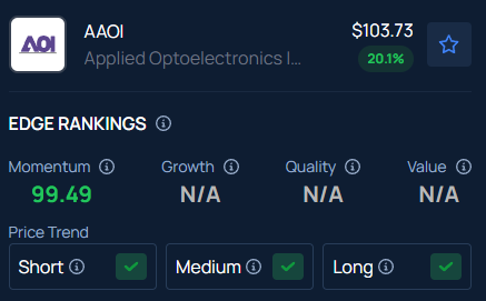 With a strong Momentum in the 99th percentile, Benzinga’s Edge Stock Rankings indicate that AAOI has a positive price trend across all time frames.