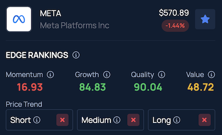 Benzinga Edge Stock Rankings indicate Meta is in a downtrend across the short, medium and long-term, despite ranking in the 90th percentile for Quality.