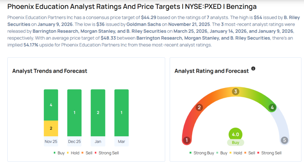 Analysts expect the Phoenix, Arizona-based company to report quarterly earnings of 34 cents per share. That’s down from the $1.69 per share in the year-ago period. The consensus estimate for Phoenix Education Partners’ quarterly revenue is $220.82 million (it reported $762.1 million last year), according to Benzinga Pro.