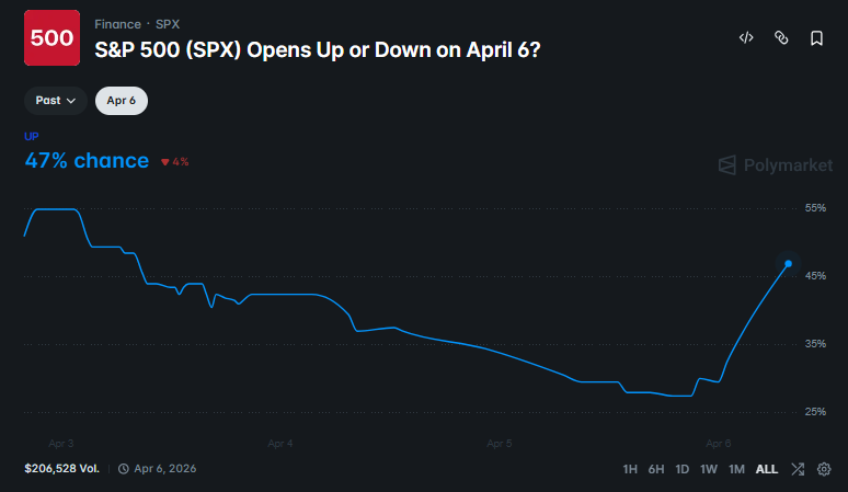 The Polygon-based (CRYPTO: POL) Polymarket crowd is currently split, reflecting extreme uncertainty heading into Monday’s open. The “S&P 500 Opens Up or Down on April 6?” market shows a 47% chance of an “Up” open, a slight 4% decline in confidence over the weekend. Early trading volume for the Monday bet has reached $206,528.