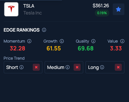 Benzinga Edge Stock Rankings indicate Tesla stock has a Momentum in the 32nd percentile and Value in the 3rd percentile.