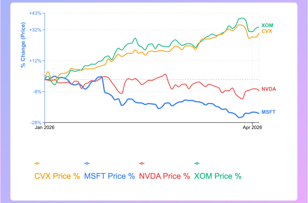The chart below compares the year-to-date stock performances of MSFT, NVDA, XOM and CVX: