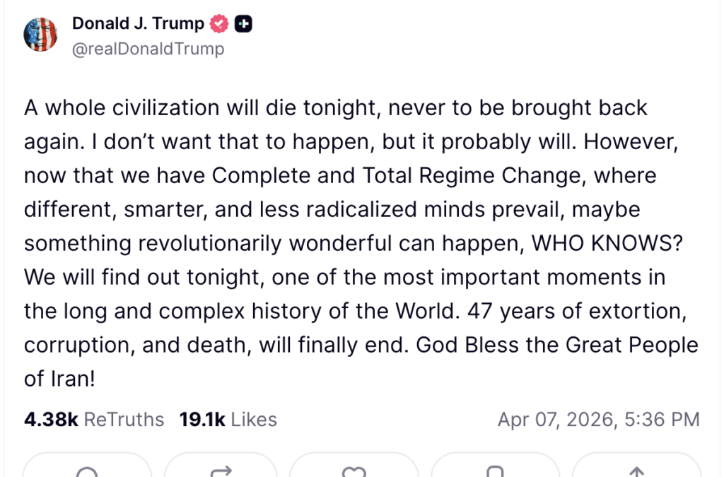 President Donald Trump took to Truth Social on Tuesday morning ahead of his “power plant day and bridge day” deadline to issue another warning to Iran.
