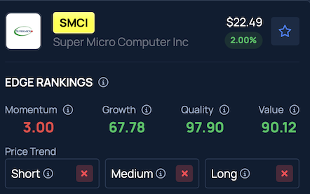 Benzinga Edge Rankings placed SMCI’s Quality score in the 97th percentile, while its Price Trend remained negative across short, medium and long-term timeframes.