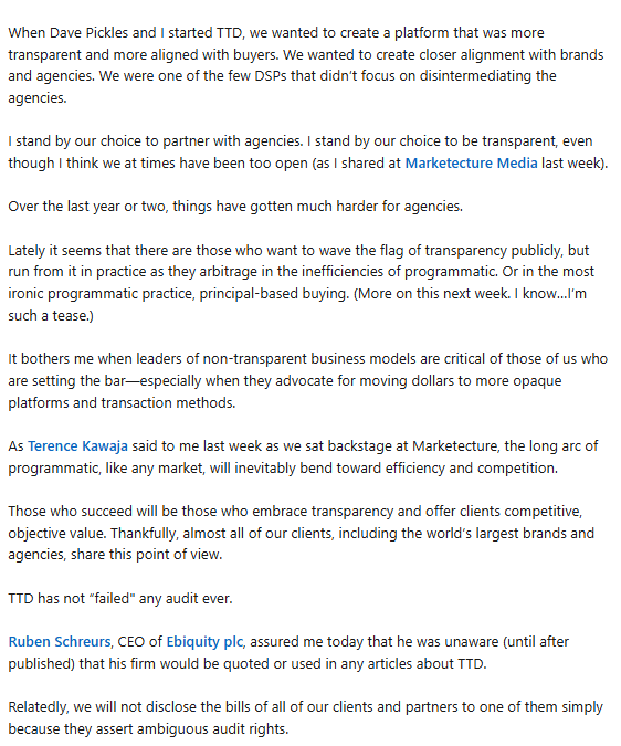 The Trade Desk disputed the findings, with CEO Jeff Green writing in a LinkedIn post, “TTD has not ‘failed’ any audit ever.”