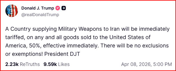 President Donald Trump declared on Wednesday via Truth Social that any country selling arms to Iran would be subjected to a 50% tariff on all goods sold to the United States.