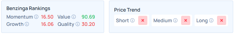 Despite the highly attractive value score, Alibaba continues to face severe near-term technical headwinds. Benzinga Edge Stock Rankings‘ data shows that the stock’s short, medium, and long-term price trends all indicate a downward trajectory.