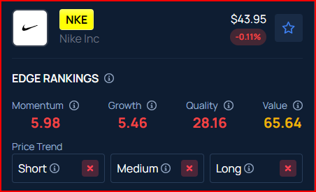 Benzinga’s Edge Rankings place Nike in the 28th percentile for quality and the 65th percentile for value, reflecting its mixed performance. Benzinga’s screener allows you to compare Nike’s performance with its peers.