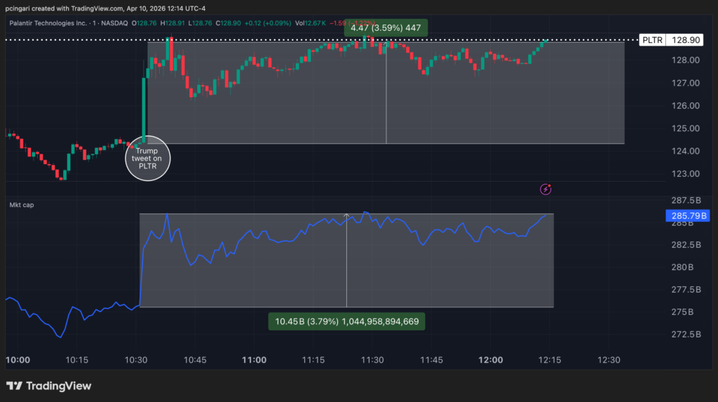 Trump threw an unexpected lifeline to Palantir Technologies Inc. (NASDAQ:PLTR), praising the firm’s “great war fighting capabilities and equipment” — adding, “Just ask our enemies!!!” — precisely as the stock was wrapping up its worst weekly performance since February 2021.