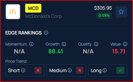 Benzinga’s Edge Rankings place McDonald’s in the 88th percentile for growth and the 15th percentile for value, reflecting its mixed performance. Benzinga’s screener allows you to compare McDonald’s performance with its peers.