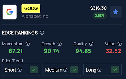 GOOGL carries a Quality score in the 94th percentile of Benzinga Edge rankings, reflecting positive trends across short, medium and long-term timeframes.