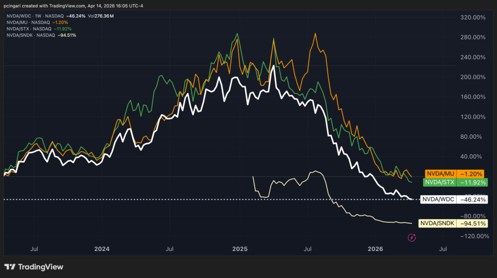 Chart: 3-Year Relative Performance — NVDA vs SNDK, WDC, STX, MU