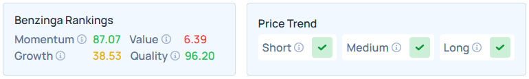 The stock closed Tuesday 0.27% higher at $380.78 apiece. Benzinga’s Edge Stock Rankings indicate that AVGO maintains a strong price trend in the short, medium, and long terms, with a solid quality score.