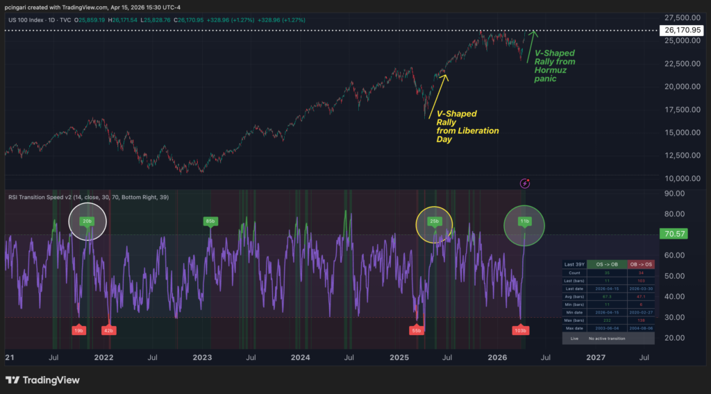 That is the fastest oversold-to-overbought RSI transition in the Nasdaq 100’s 40-year recorded history, according to the TradingView RSI Transition Speed indicator.