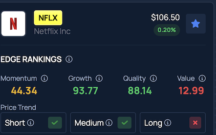 NFLX ranks in the 93rd percentile for Growth on Benzinga Edge, suggesting strong short and mid-term trends but relatively weaker long-term performance.