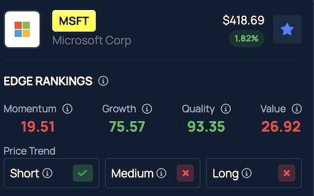 MSFT is in the 93rd percentile for Quality on Benzinga Edge, indicating a strong short-term trend but weaker performance across the mid- and long-term.