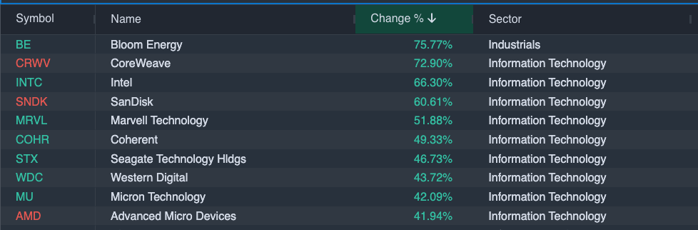 Coherent Corp. gained 49.33% in the window, extending a 12-month rally of roughly 448% driven by AI data centers migrating from copper to optical interconnects to sustain the bandwidth demands of next-generation compute clusters.