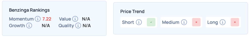 Benzinga’s Edge Rankings shows a weak momentum score of 7.22, with a price trend indicating short-term strength but medium- and long-term weakness.