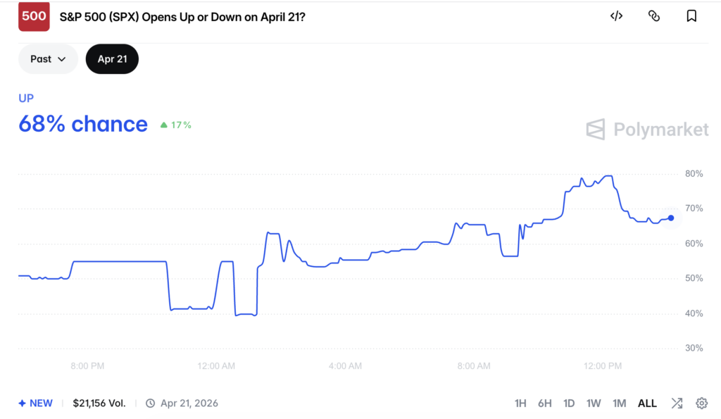 The Polygon-based (CRYPTO: POL) Polymarket crowd is still optimistic heading into Tuesday. The April 21 market shows a 68% bet on “Up,” with early trading activity building on whether the S&P 500 will open higher or lower.