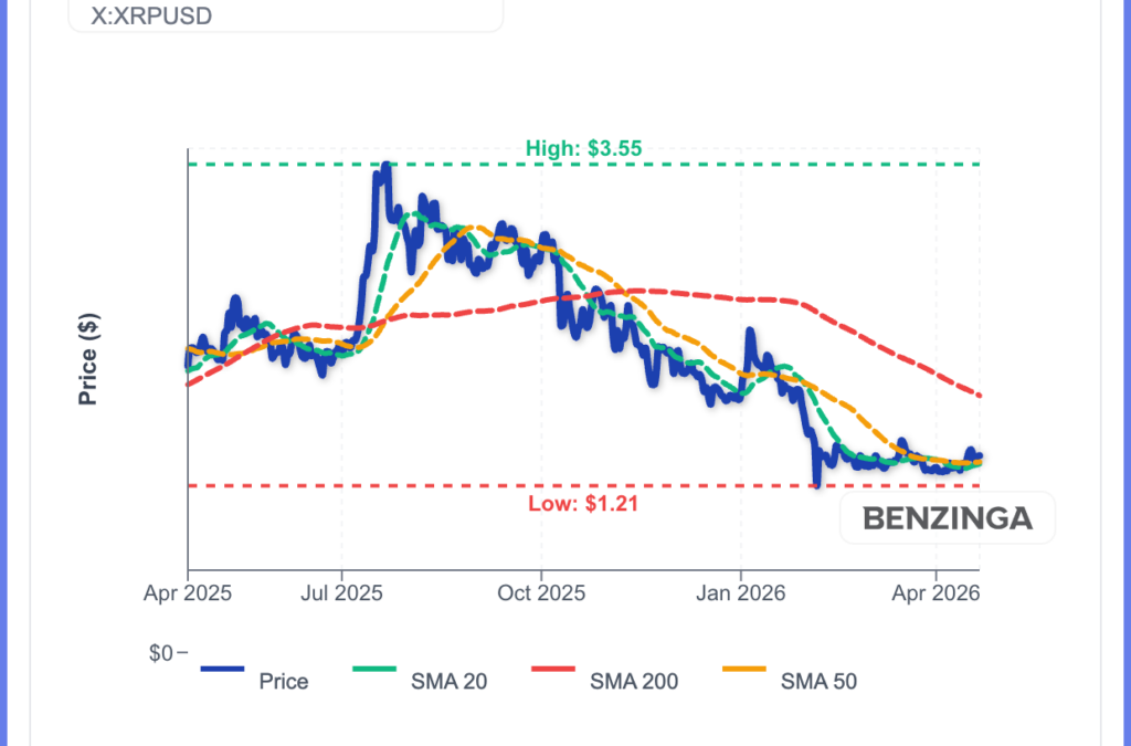 Price has broken above the Supertrend at $1.2934 and is holding above the 20 EMA at $1.3934 and 50 EMA at $1.4124 simultaneously—the cleanest EMA structure XRP has shown since the August 2025 peak.