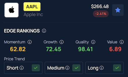 AAPL sits in the 98th percentile for Quality on Benzinga Edge, underscoring its strong performance across short, medium and long-term trends.