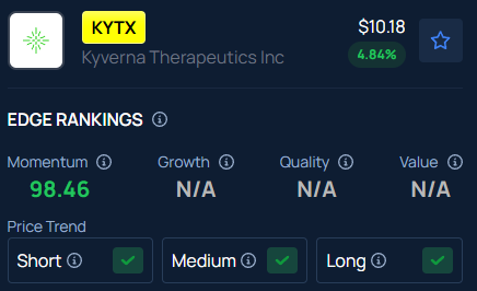 With a strong Momentum in the 98th percentile, Benzinga’s Edge Stock Rankings indicate that KYTX has a positive price trend across all time frames.