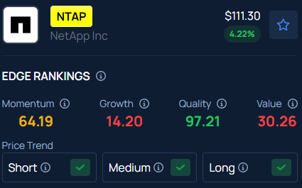 Benzinga’s Edge Stock Rankings indicate NTAP stock has a positive price trend across all time frames.