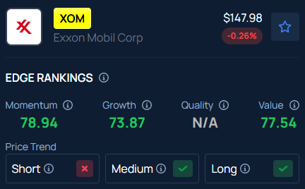 Benzinga’s Edge Stock Rankings indicate that XOM is experiencing short-term consolidation along with medium and long-term upward movement.
