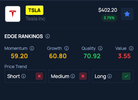 Benzinga Edge Stock Rankings show that Tesla stock has a Momentum score in the 59th percentile and Value in the 3rd percentile.
