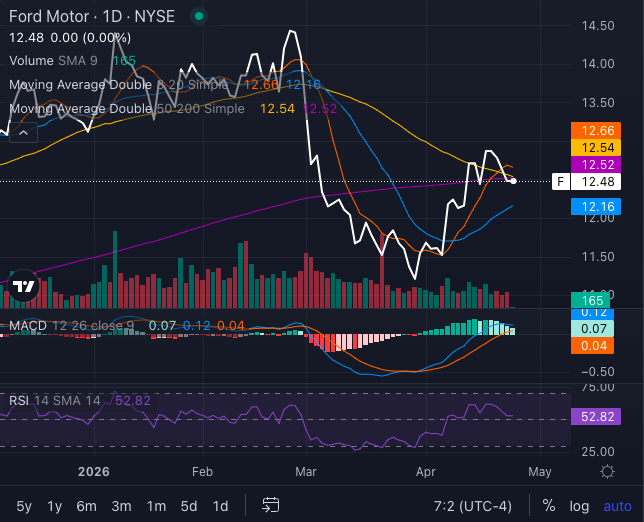 Ford’s stock is now trading below key moving averages, with the shorter-term trend rolling over into longer-term resistance. A confirmed death cross — where the 50-day moving average falls below the 200-day — would mark a shift toward a sustained downtrend.