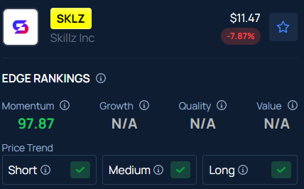 Benzinga’s Edge Stock Rankings indicate that SKLZ is experiencing stock is experiencing a positive price trend across all time frames.