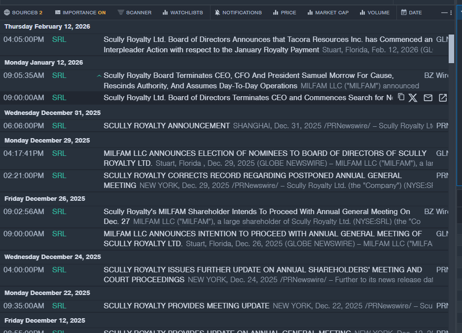 - Benzinga Pro’s newsfeed tool helped identify the developments in SRL stock.