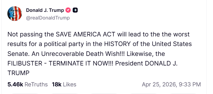 Trump has also suggested acting without congress if the senate stalls, including an executive order that would require proof of citizenship and voter id for federal elections. In another statement linked to that idea, he wrote, “There will be Voter I.D. for the Midterm Elections, whether approved by Congress or not!”