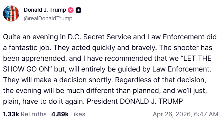 Trump added that he has asked that the “Show go on,” but will be “guided by Law Enforcement.”
