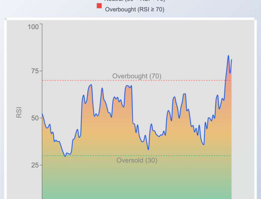 The relative strength index (RSI), a momentum gauge, is 81.43, which is firmly overbought and often lines up with choppier trading. RSI at 81.43 means buyers have been in control, but it also raises the odds of profit-taking bursts.