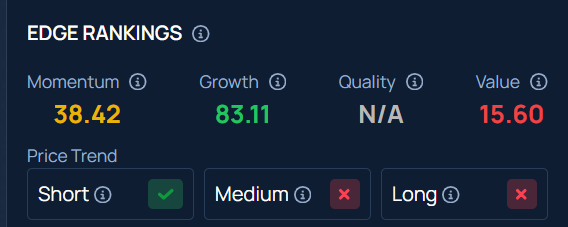 Benzinga’s Edge Stock Rankings show HOOD with weaker price momentum in medium- and long-term trends, offset by a strong Growth score.
