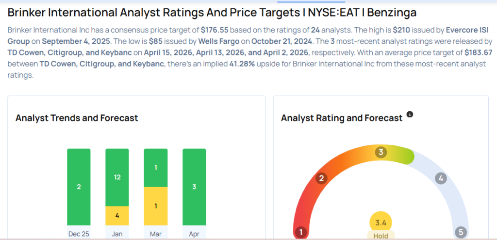 Analysts expect the Dallas, Texas-based company to report quarterly earnings of $2.86 per share. That’s up from $2.66 per share in the year-ago period. The consensus estimate for Brinker’s quarterly revenue is $1.47 billion (it reported $1.43 billion last year), according to Benzinga Pro.