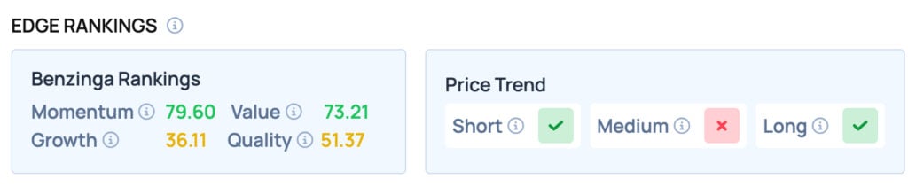 According to Benzinga Edge Rankings, GM scores well on the Momentum and Value metrics, while also providing a favorable price trend in the Long term